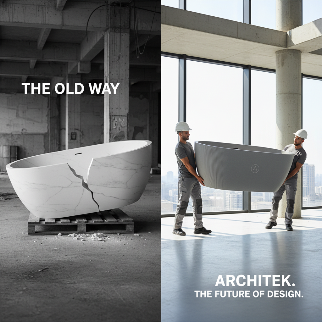 For decades, the industry equated weight with quality. A 100kg+ artificial stone tub felt substantial, but it created a logistical nightmare. High shipping costs, difficult maneuverability on job sites, and a terrifying susceptibility to cracking during transit. Traditional stone resin relies on cheap calcium carbonate fillers for bulk, resulting in a brittle product that snaps under torque or impact. This leads to replacement costs, project delays, and strained contractor relationships. The modern alternative—Rock Texture Slabs—weighs in at a manageable 60kg without sacrificing stability.